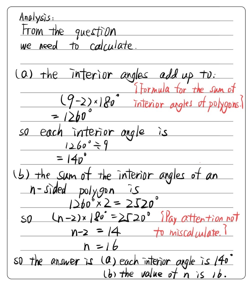 Problem 4 each interior angle of a regular polygon measures 160°. An interior angle is an angle inside a shape. The measure of an interior angle of a regular polygon is 135 degrees. Sum of interior angles of a polygon. The interior angles of a polygon and the method for calculating their values. A polygon with 23 sides has a total of 3780 degrees. Hence, the measure of each interior angle of the given regular polygon is 140°. The measures of the exterior angles of a convex quadrilateral are 90°, 10x°, 5x°, and 45°. Each time we add a side (triangle to example: Click on make irregular and observe what happens when you change the number of sides the sum of the interior angles of a polygon is given by the formula Find the exterior angle sums, one exterior angle at each vertex, of a convex nonagon. Fill in all the gaps, then press. What is the sum of the angle measures in a nonagon (9 sides)?